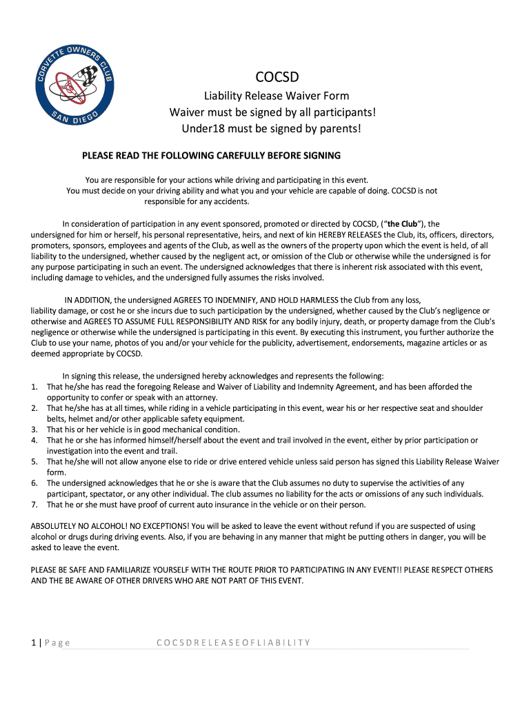 Get the free COCSD Release and Waiver of Liability