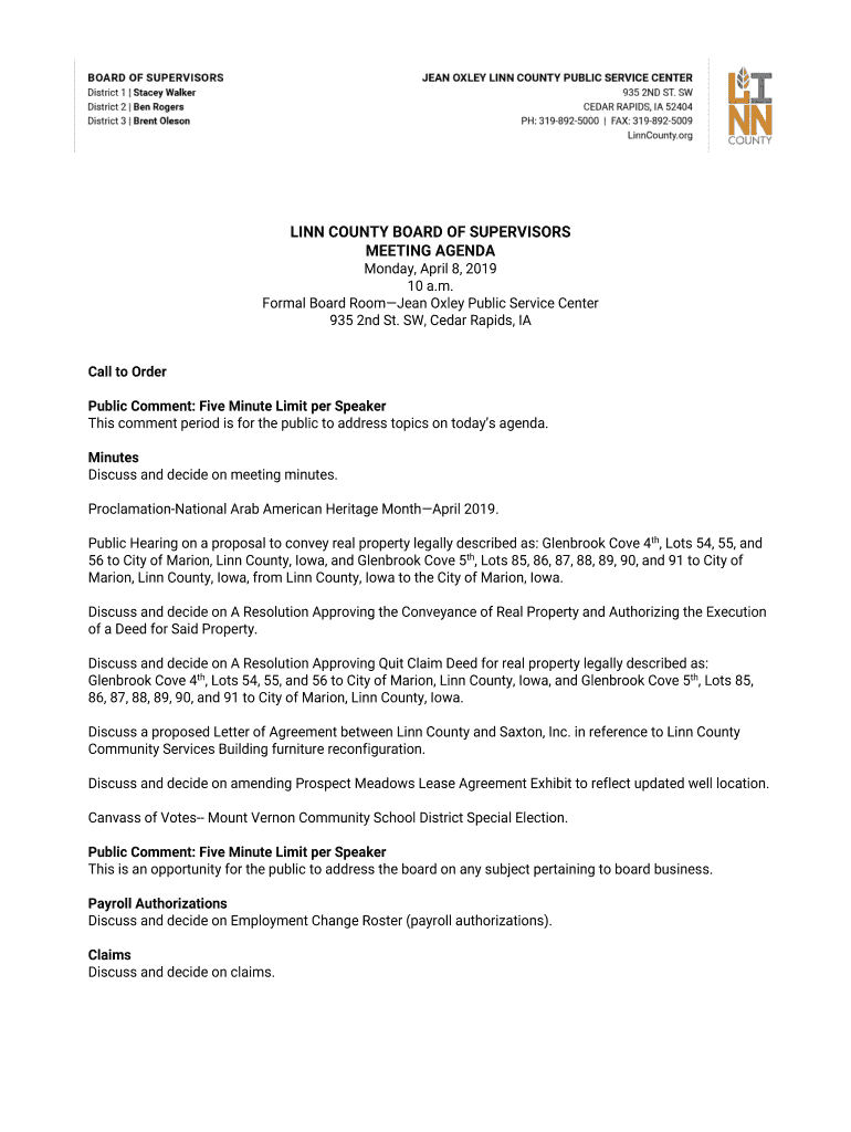 LINE COUNTY BOARD OF SUPERVISORS MEETING AGENDA Monday, April 8, 2019 10 a.m. Formal Board Room Jean Oxley Public Service Center 935 2nd St. SW, Cedar Rapids, IA Call to Order Public Comment: Five