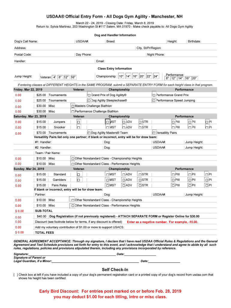 To fill out dogs gym agility, participants will need to provide information about their dog, contact details, event participation, and any relevant training history.