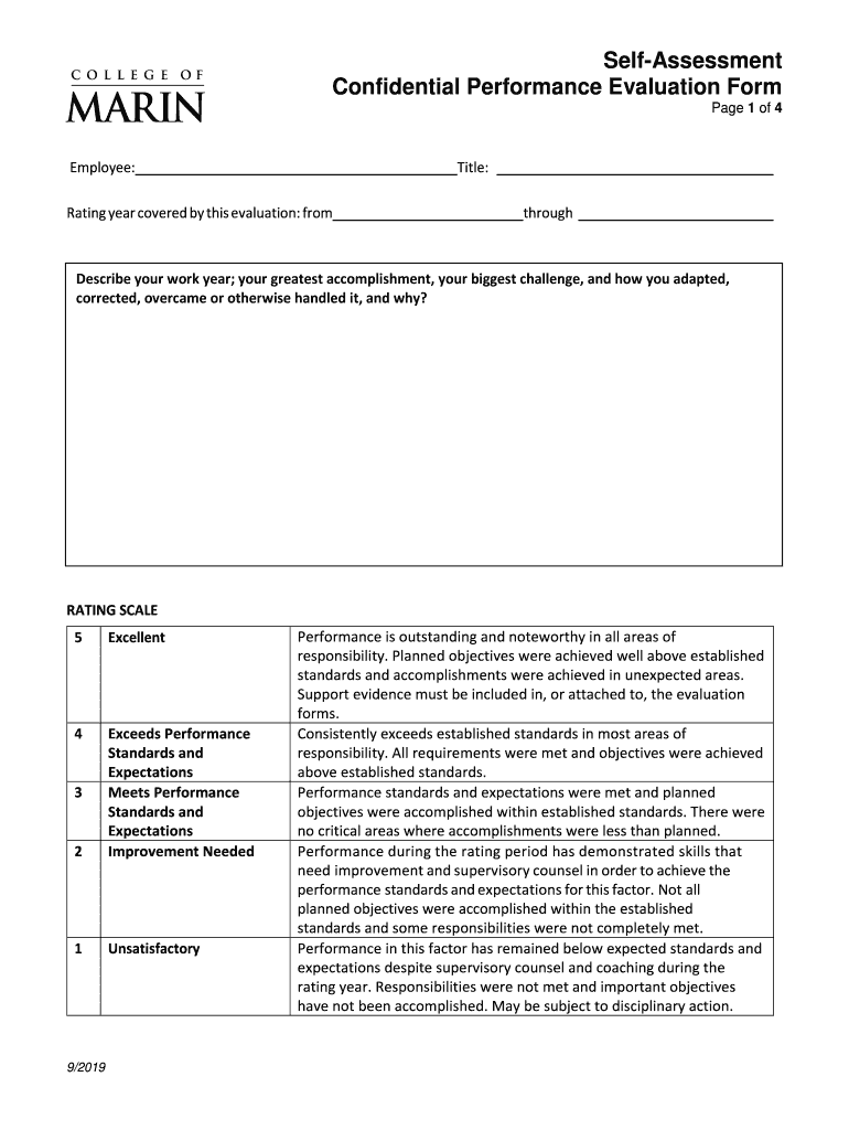 Page 1 of 4Employee:Title:Rating year covered by this evaluation: fromthroughDescribe your work year; your greatest accomplishment, your biggest
