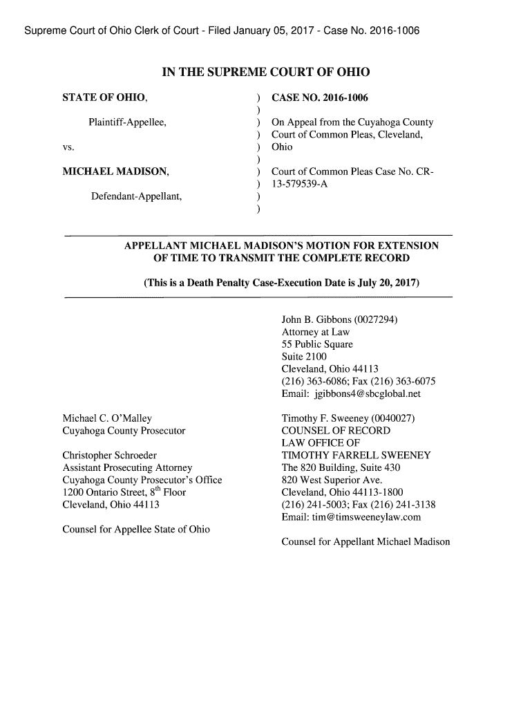 Supreme Court of Ohio Clerk of Court Filed January 05, 2017, Case No. 20161006IN THE SUPREME COURT OF OHIO STATE OF OHIO, PlaintiffAppellee, vs. MICHAEL MADISON, DefendantAppellant, ) )))))))))CASE