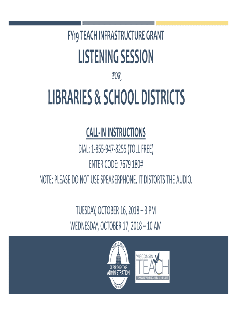 FY19 TEACH INFRASTRUCTURE GRANTLISTENING SESSION LIBRARIES & SCHOOL DISTRICTS CALLING INSTRUCTIONS DIAL: 18559478255 (TOLL FREE) ENTER CODE: 7679 180# NOTE: PLEASE DO NOT USE SPEAKERPHONE. IT DISTORTS