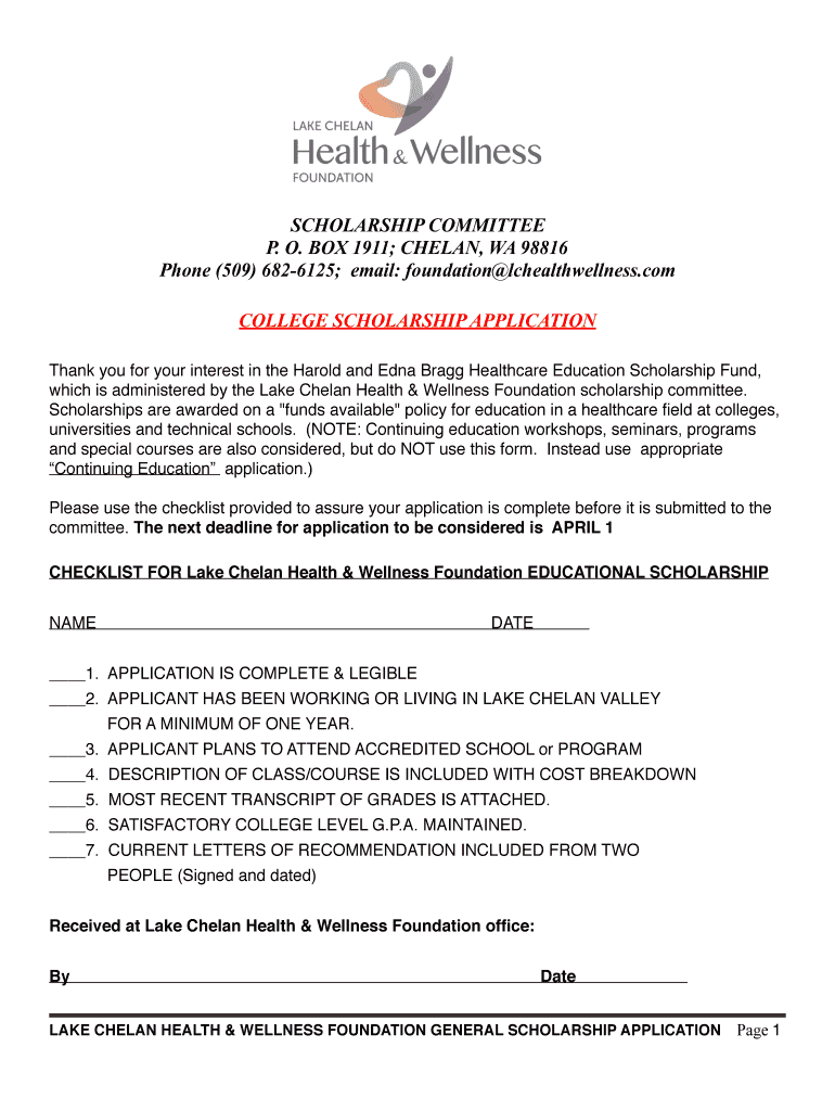 SCHOLARSHIP COMMITTEE P. O. BOX 1911; CLAN, WA 98816 Phone (509) 6826125; email: foundation lchealthwellness.com COLLEGE SCHOLARSHIP APPLICATION Thank you for your interest in the Harold and Edna