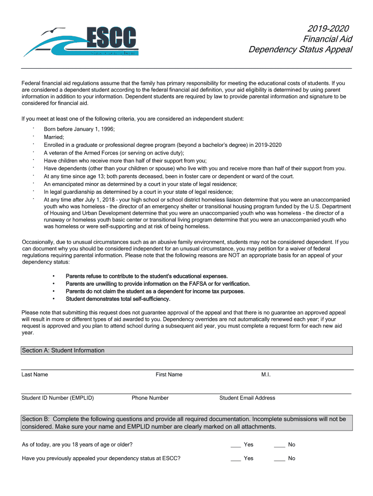 Dependency Status Appeal Federal financial aid regulations assume that the family has primary responsibility for meeting the educational costs of students. If you