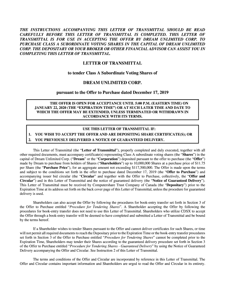 Get the free LETTER OF TRANSMITTAL to tender Class A Subordinate ...