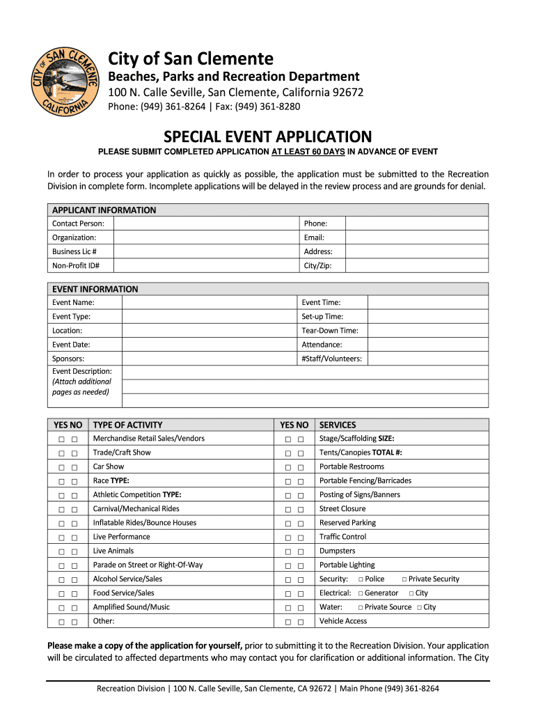 City of San Clemente Beaches, Parks and Recreation Department 100 N. Called Seville, San Clemente, California 92672 Phone: (949) 3618264 Fax: (949) 3618280SPECIAL EVENT PROCEDURE & APPLICATION (Please