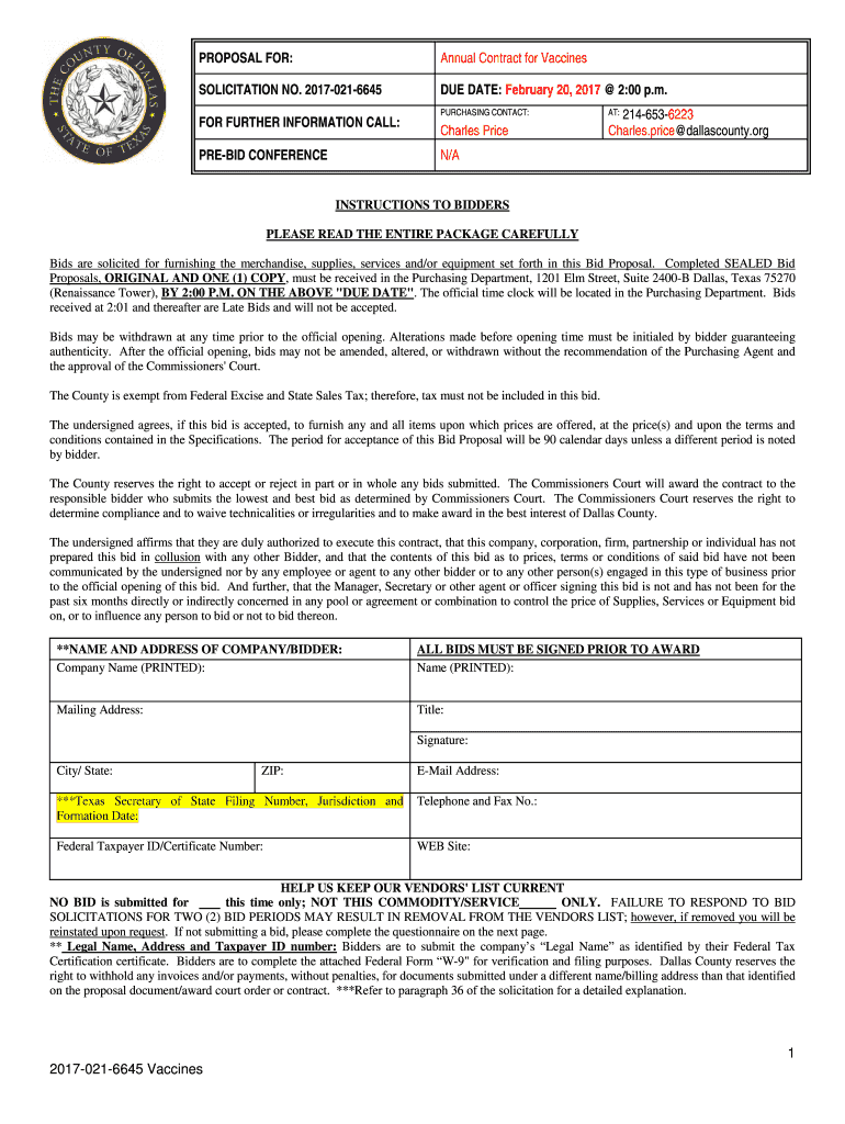 PROPOSAL FOR:Annual Contract for VaccinesSOLICITATION NO. 20170216645DUE DATE: February 20, 2017 2:00 p.m.FOR FURTHER INFORMATION CALL: PREBID CONFERENCEPURCHASING CONTACT:Charles Price2146536223
