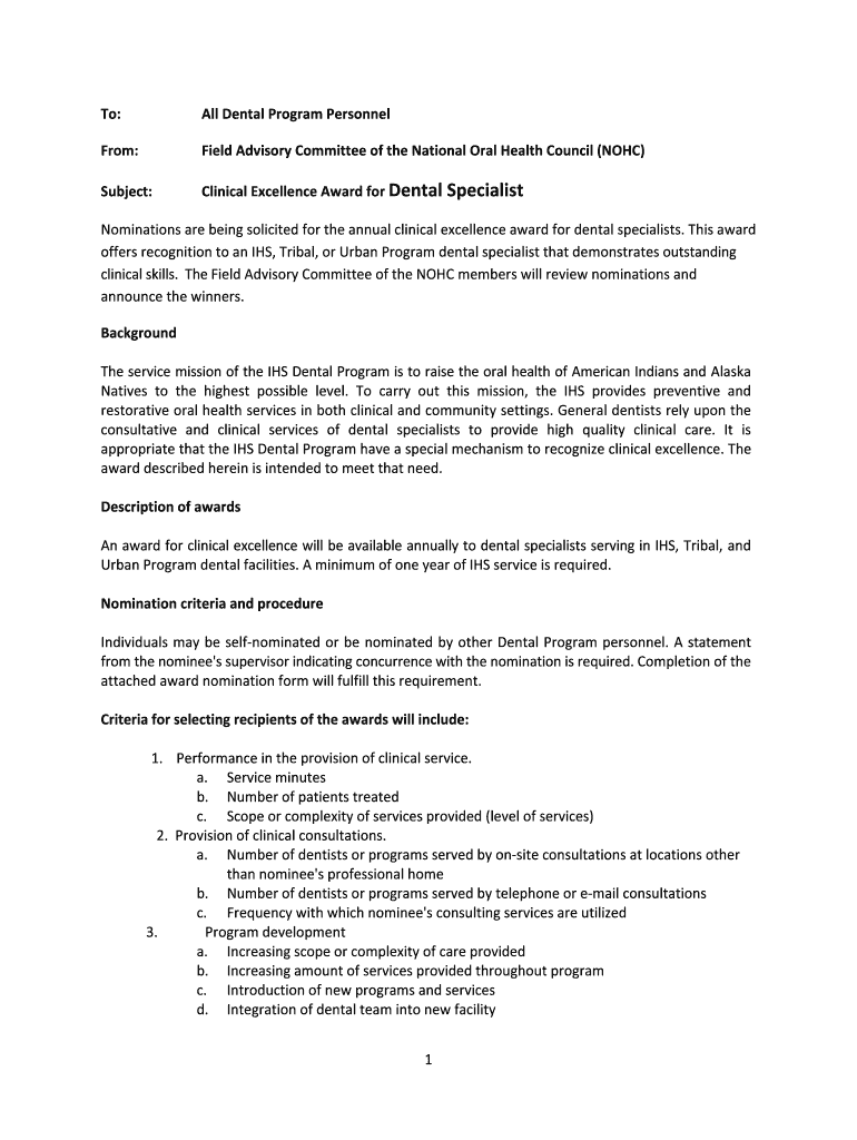 To:All Dental Program PersonnelFrom:Field Advisory Committee of the National Oral Health Council (DOHC)Subject:Clinical Excellence Award for Dental SpecialistNominations are being solicited for the annual clinical excellence award for dental specialists. This award