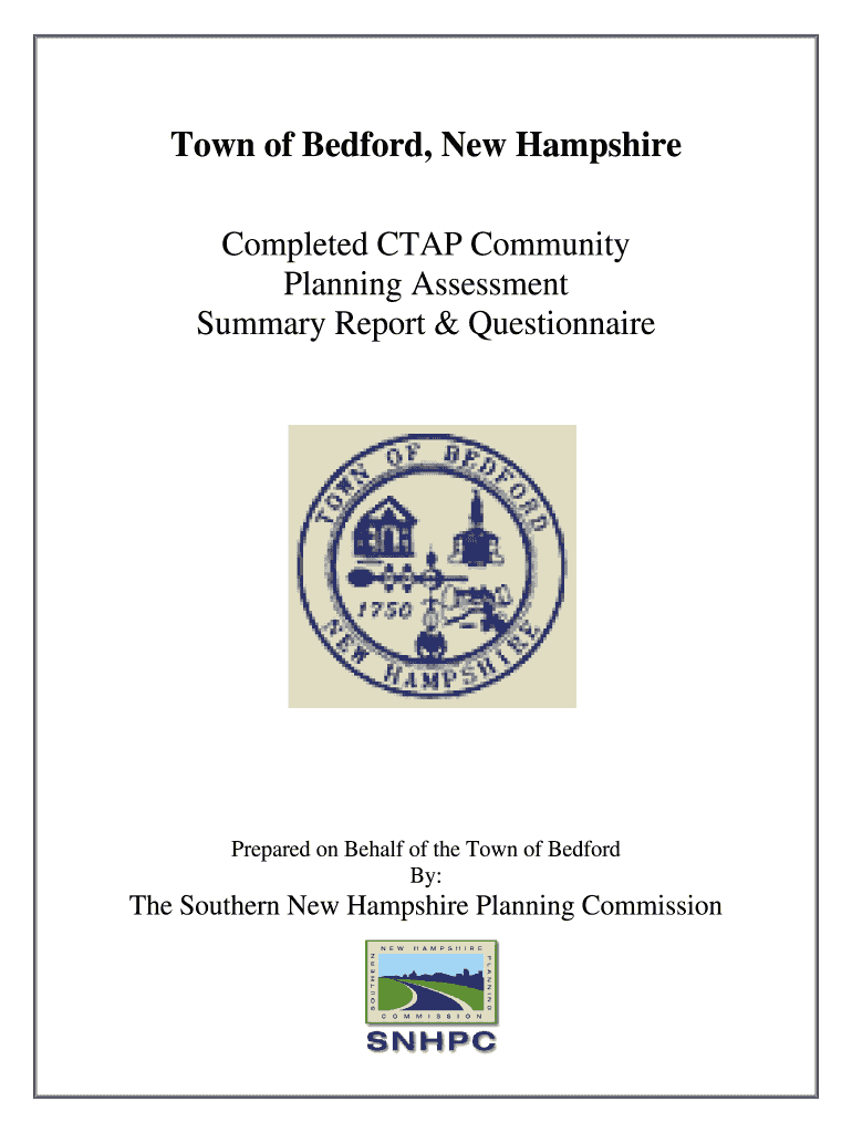 Town of Bedford, New Hampshire Completed CAP Community Planning Assessment Summary Report & QuestionnairePrepared on Behalf of the Town of Bedford By:The Southern New Hampshire Planning CommissionTown