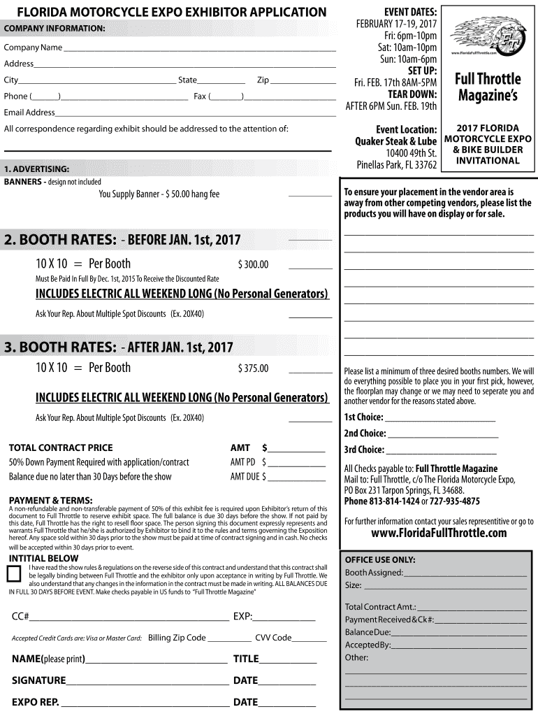 FLORIDA MOTORCYCLE EXPO EXHIBITOR APPLICATION COMPANY INFORMATION:Company Name Address City State Zip Phone () Fax () Email Address All correspondence regarding exhibit should be addressed to the