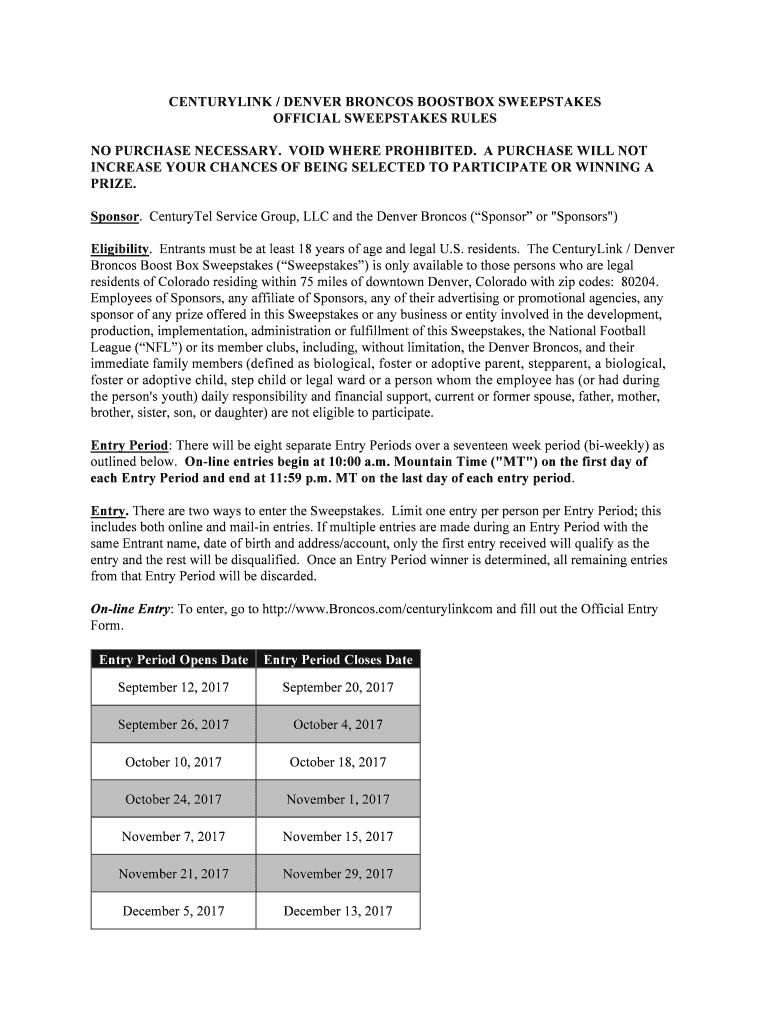 CenturyLink / DENVER BRONCOS BOOST BOX SWEEPSTAKES OFFICIAL SWEEPSTAKES RULES NO PURCHASE NECESSARY. VOID WHERE PROHIBITED. A PURCHASE WILL NOT INCREASE YOUR CHANCES OF BEING SELECTED TO PARTICIPATE