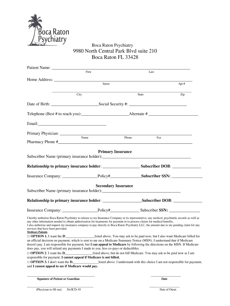 Boca Raton Psychiatry9980 North Central Park Blvd suite 210 Boca Raton FL 33428 Patient Name: FirstLastHome Address: Street # City State Update of Birth: Social Security #: Telephone (Best # to reach