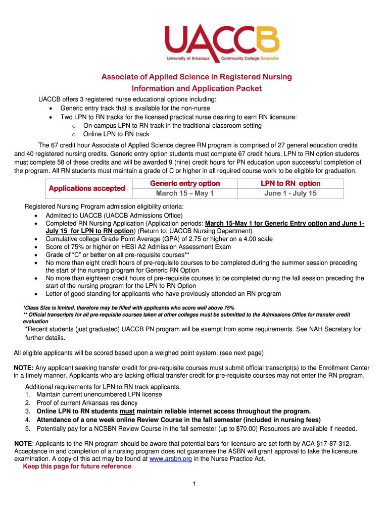 Associate of Applied Science in Registered Nursing Information and Application Packet UA CCB offers 3 registered nurse educational options including: Generic entry track that is available for the