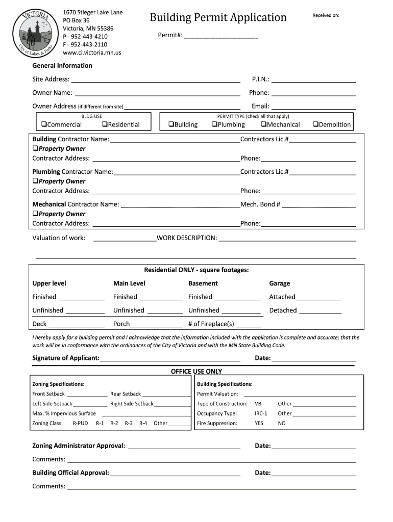 1670 Stinger Lake Lane PO Box 36 Victoria, MN 55386 P 9524434210 F 9524432110 www.ci.victoria.mn.usBuilding Permit ApplicationReceived on:Permit#: General Information Site Address: P.I.N.: Owner Name: