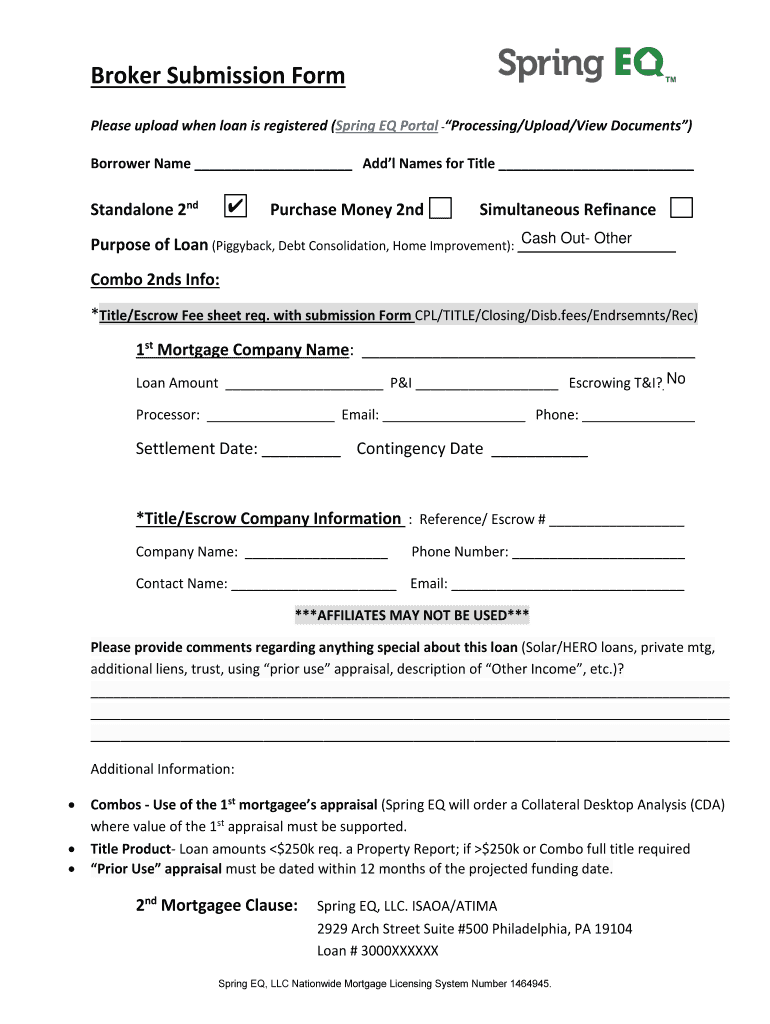 Broker Submission Form Please upload when loan is registered (Spring EQ Portal Processing/Upload/View Documents) Borrower Name Add Names for Title Standalone 2ndPurchase Money 2ndSimultaneous Refinance