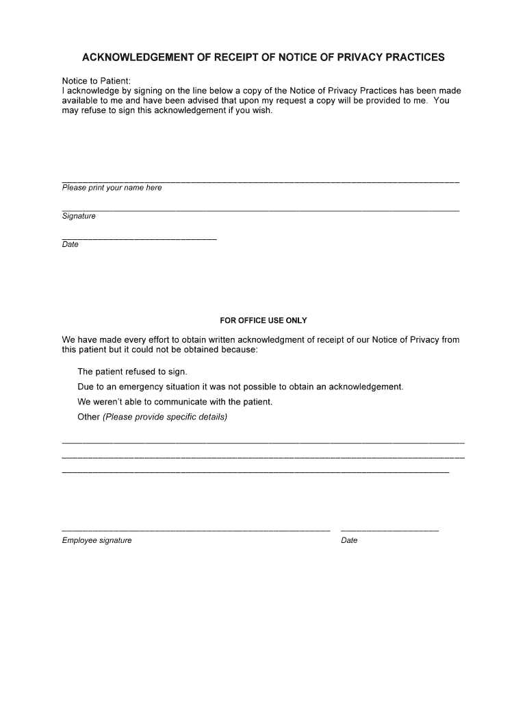 ACKNOWLEDGEMENT OF RECEIPT OF NOTICE OF PRIVACY PRACTICES Notice to Patient: I acknowledge by signing on the line below a copy of the Notice of Privacy Practices has been made available to me and