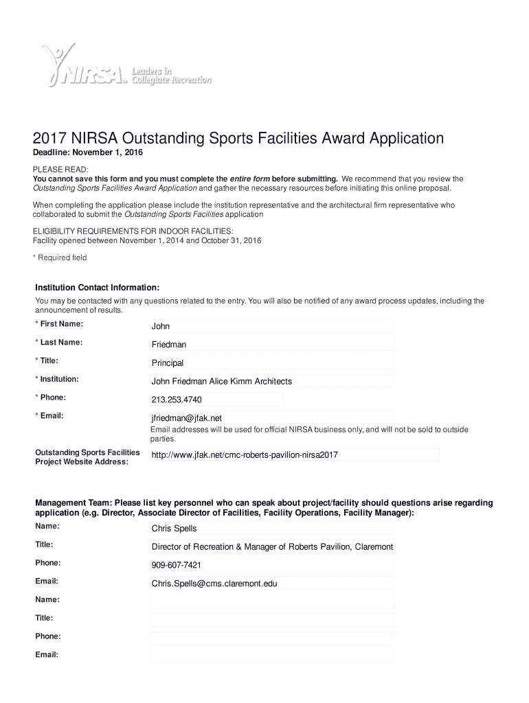 Any organization, institution, or individual that wants to recognize an outstanding sports facility can benefit from using NIRSA forms. This may include universities, colleges, sports complexes, recreational centers, or any other entity that wants to showcase the quality and excellence of their sports facility.