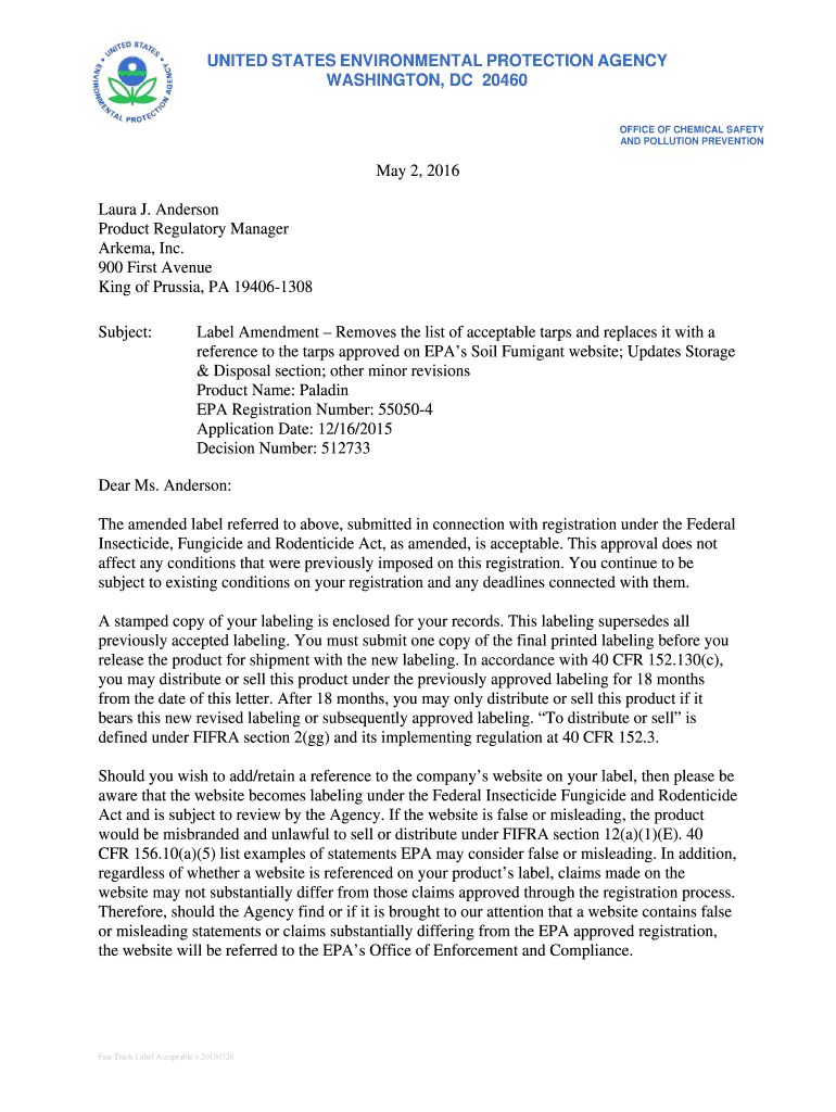 UNITED STATES ENVIRONMENTAL PROTECTION AGENCY WASHINGTON, DC 20460 OFFICE OF CHEMICAL SAFETY AND POLLUTION PREVENTION May 2, 2016, Laura J. Anderson Product Regulatory Manager Area, Inc. 900 First