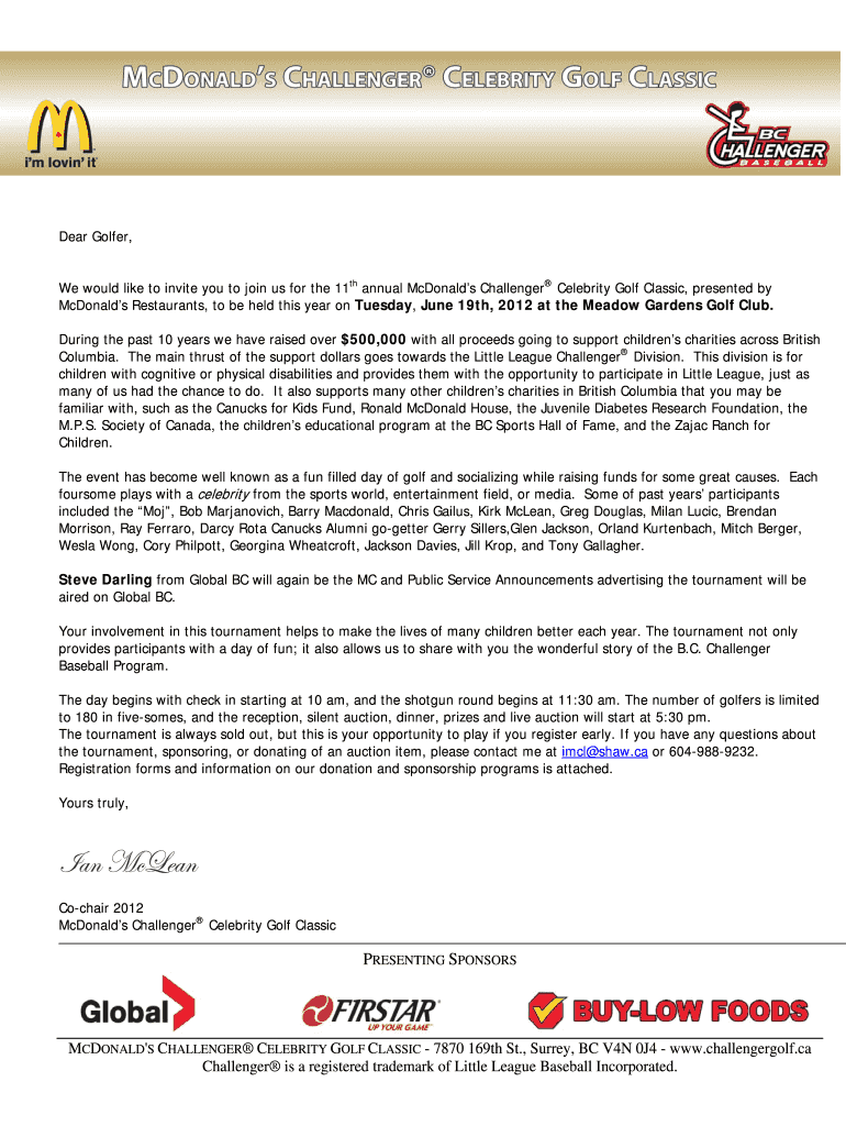 We would like to invite you to join us for the 11th annual McDonald's Challenger Celebrity Golf Classic, presented by