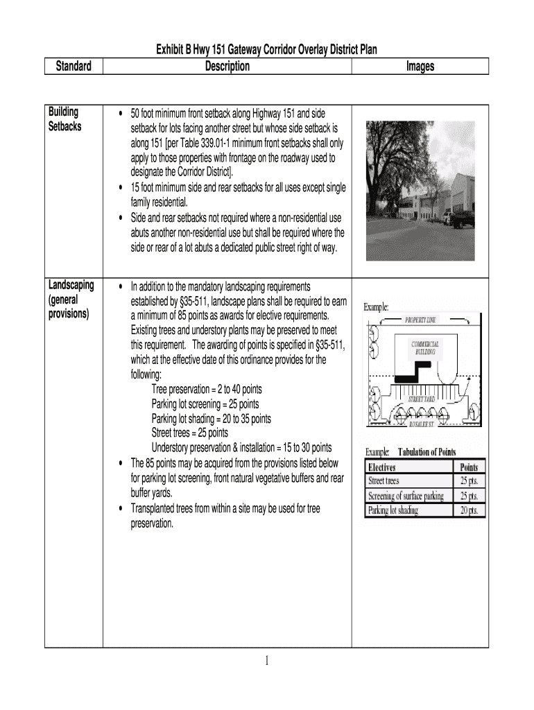 Exhibit B Hwy 151 Gateway Corridor Overlay District Plan DescriptionStandard Building Setbacks Landscaping (general provisions) 50 foot minimum front setback along Highway 151 and side setback for
