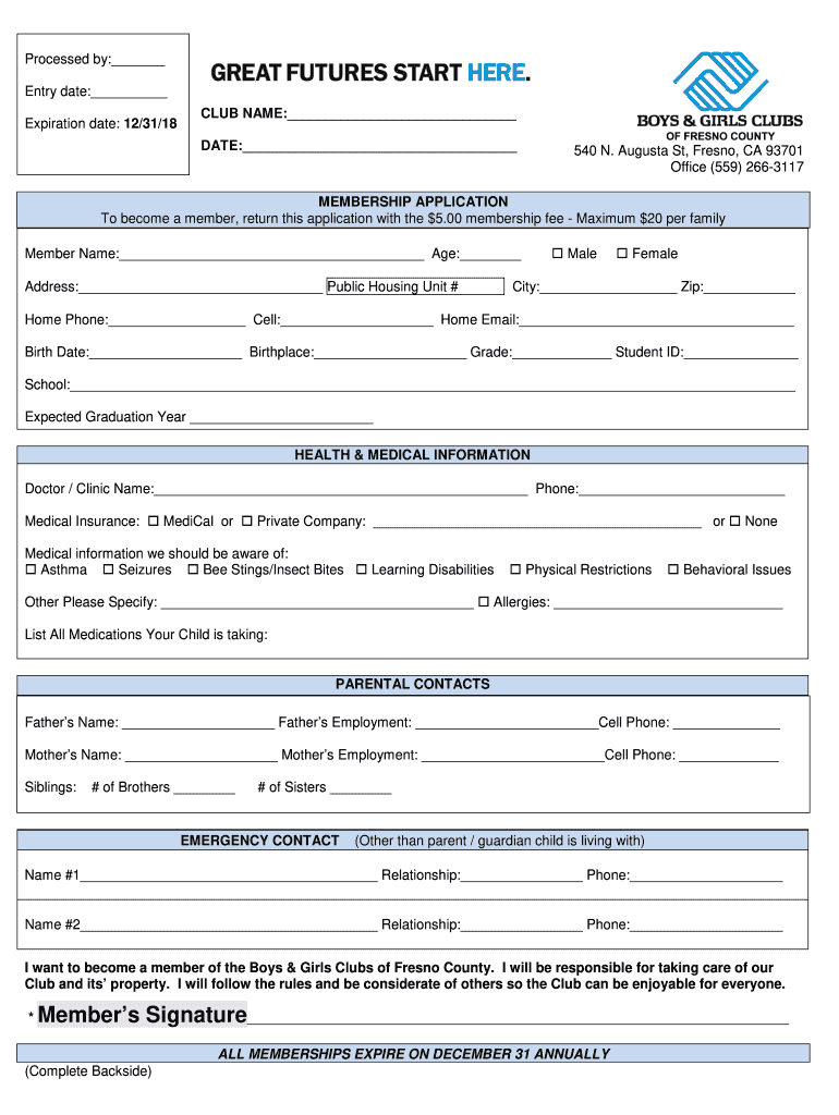 Processed by: Entry date: Expiration date: 12/31/18CLUB NAME: DATE: 540 N. Augusta St, Fresno, CA 93701 Office (559) 2663117MEMBERSHIP APPLICATION To become a member, return this application with
