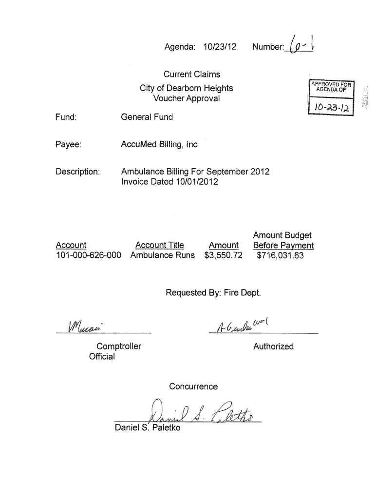 Fund:General Fundraise:Accused Billing, Description:Ambulance Billing For September 2012