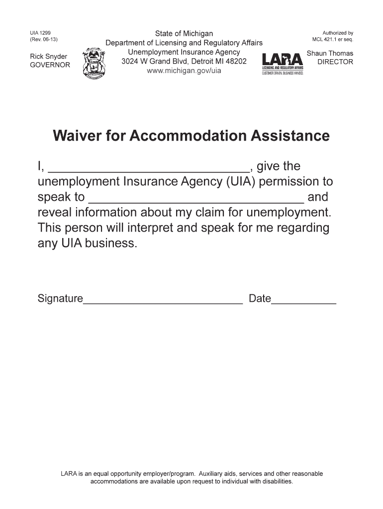 UIA 1299 (Rev. 0613)Rick Snyder Governorate of Michigan Department of Licensing and Regulatory Affairs Unemployment Insurance Agency 3024 W Grand Blvd, Detroit MI 48202 www.michigan.gov/uiaAuthorized