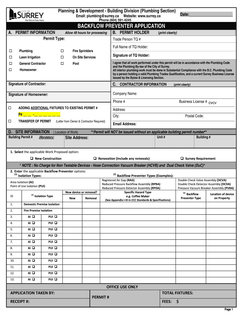 Planning & Development Building Division (Plumbing Section) Email: plumbing surrey.caudate: Website: www.surrey.caPhone (604) 5914245BACKFLOW PREVENTER APPLICATION. PERMIT INFORMATION Allow 48 hours