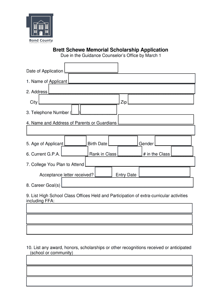 To fill out the Brett Schewe Memorial Scholarship, students need to complete the application form and submit any required supporting documents as instructed.