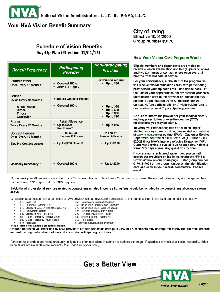 National Vision Administrators, L.L.C. DBA ENVY, L.L.C. Your NVA Vision Benefit Summary City of Irving Effective 10/01/2000 Group Number #0170Schedule of Vision Benefits Buy Plan (Effective 01/01/12)