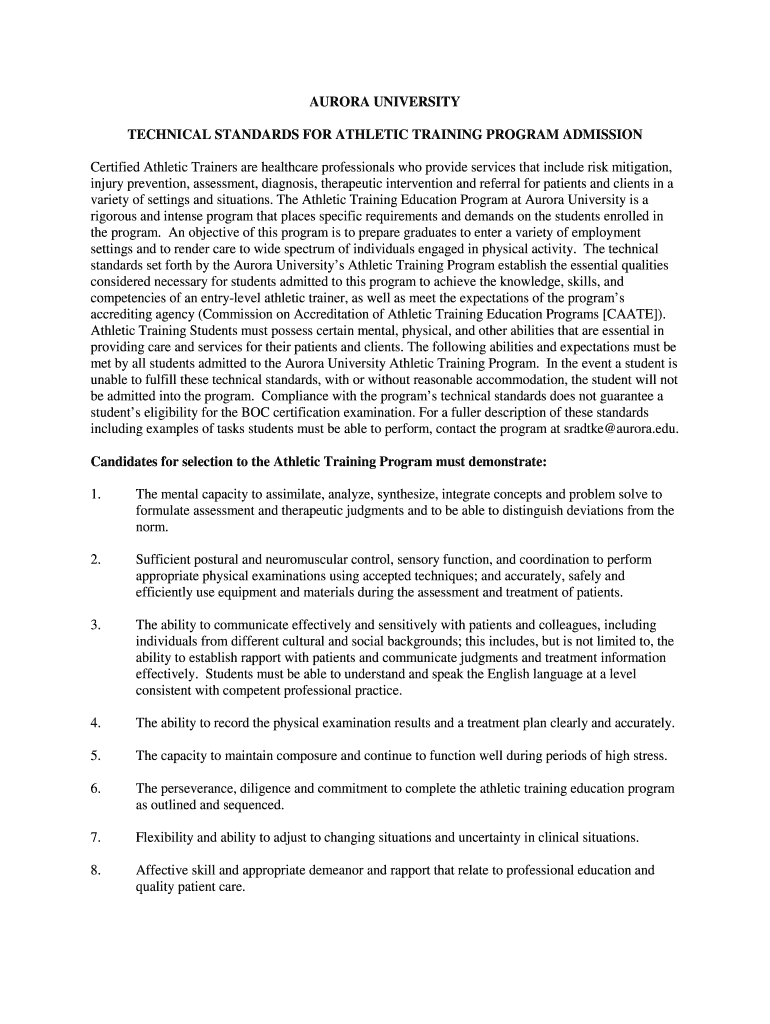 TECHNICAL STANDARDS FOR ATHLETIC TRAINING PROGRAM ADMISSION