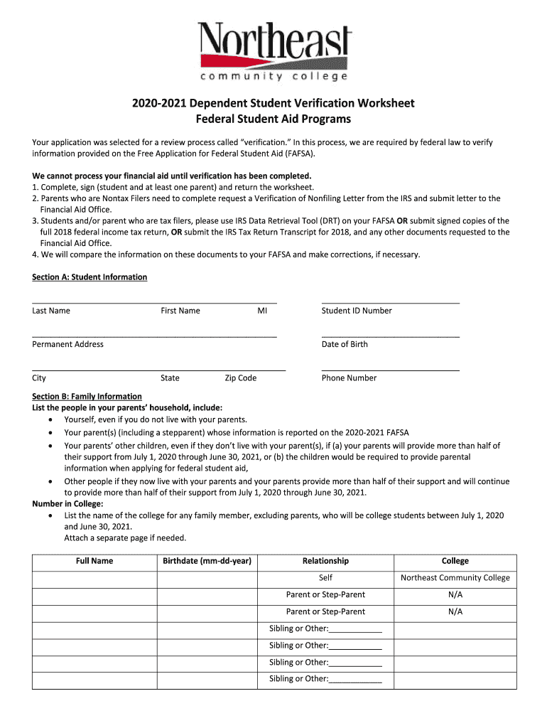 The verification worksheet in Florida typically requires information about the student's income, assets, and family size.