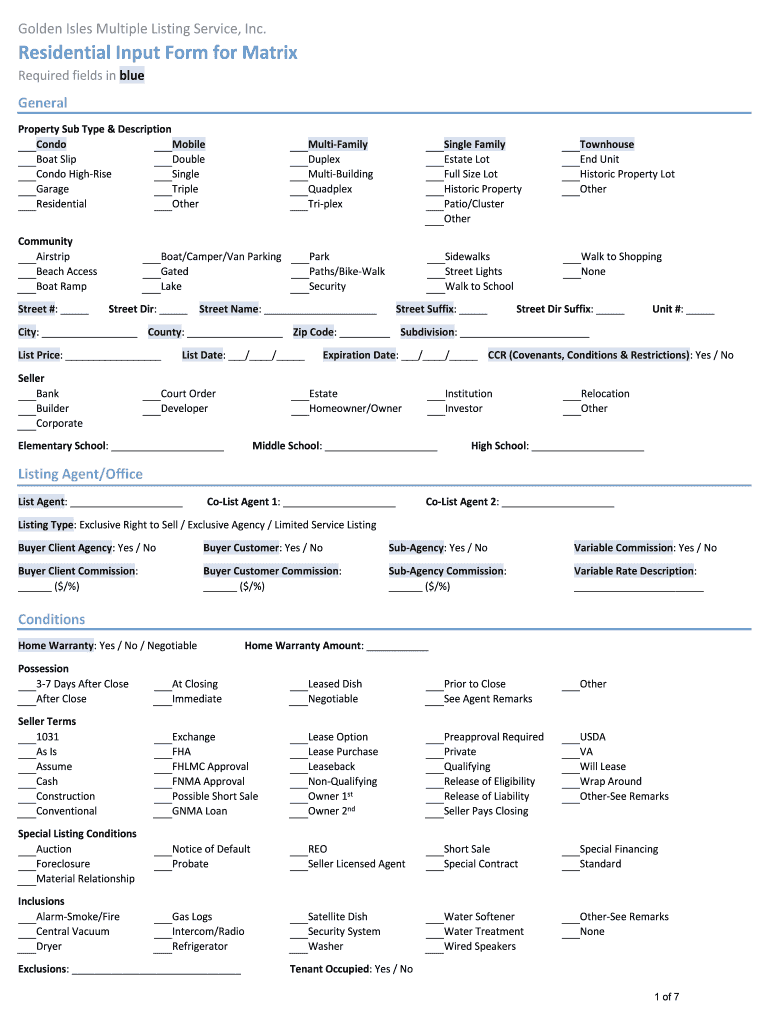 Golden Isles Multiple Listing Service, Inc. Residential Input Form for Matrix Required fields in blueGeneral Property Sub Type & Description Condo Mobile Boat Slip Double Condo High-rise Single Garage