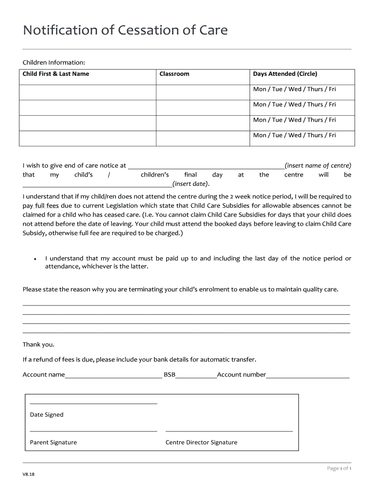 Notification of Cessation of Care Children Information: Child First & Last NameClassroomDays Attended (Circle) Mon / Tue / Wed / Thurs / Fri Mon / Tue / Wed / Thurs / Fri Mon / Tue / Wed / Thurs /
