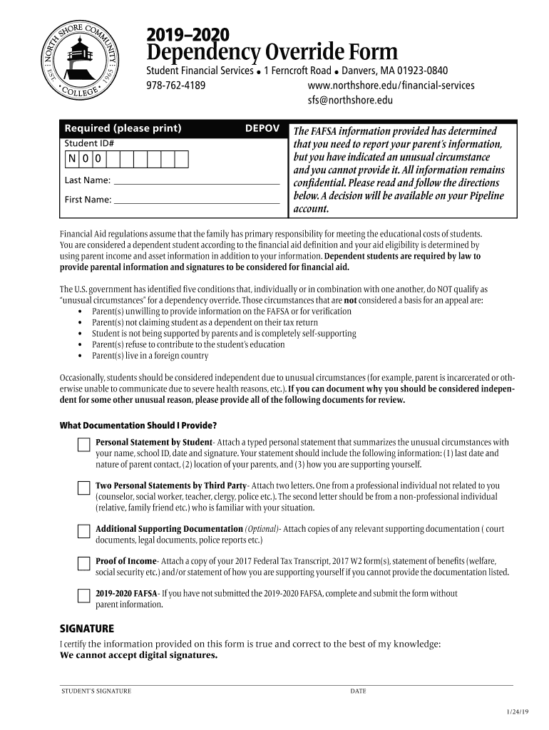 20192020Dependency Override FormStudent Financial Services 1 Fern croft Road Dancers, MA 019230840 9787624189www.northshore.edu/financialservicessfs north shore.edu Required (please print)DEPOVStudent
