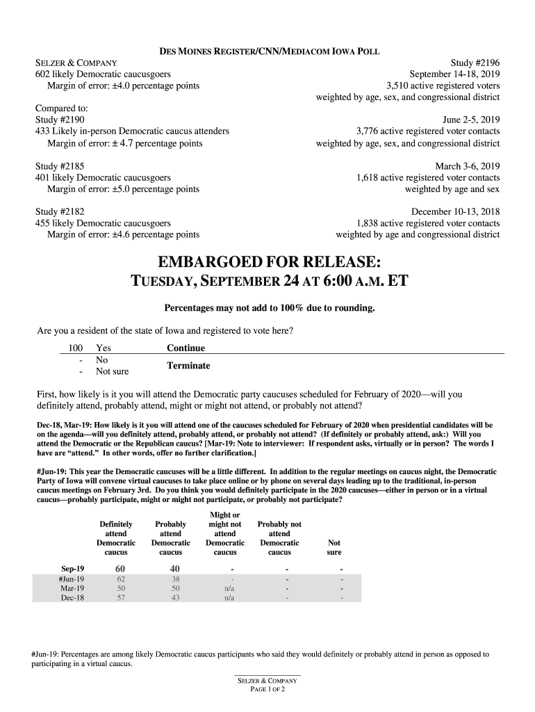 DES MOINES REGISTER/CNN/MEDIA COM IOWA POLL SELLER & COMPANY Study #2196 602 likely Democratic caucus goers September 1418, 2019 Margin of error: 4.0 percentage points 3,510 active registered voters