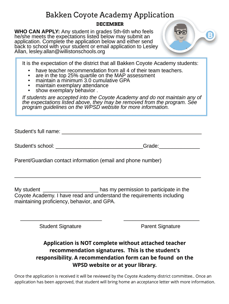 Back k en Coyote Academy Application DEEM BER WHO CAN APPLY: Any student in grades 5th6th who feels he/she meets the expectations listed below may submit an application. Complete the application below