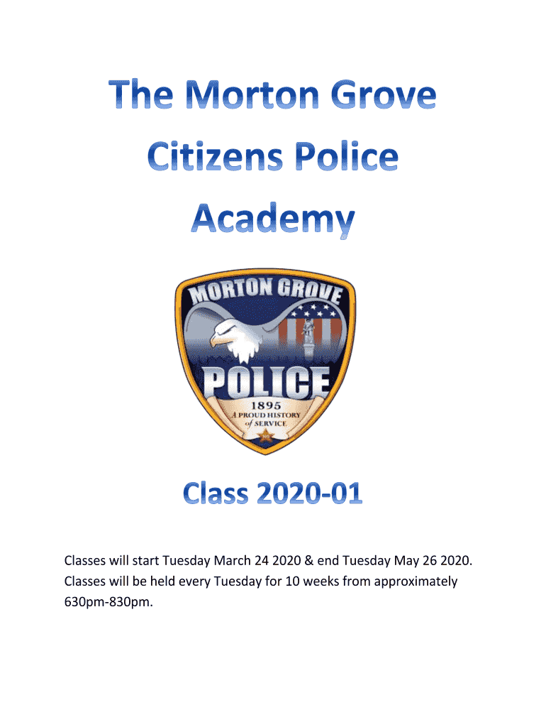 Classes will start Tuesday, March 24, 2020 & end Tuesday, May 26, 2020. Classes will be held every Tuesday for 10 weeks from approximately 630pm830pm. Morton Grove Citizens Police AcademyWhat is the