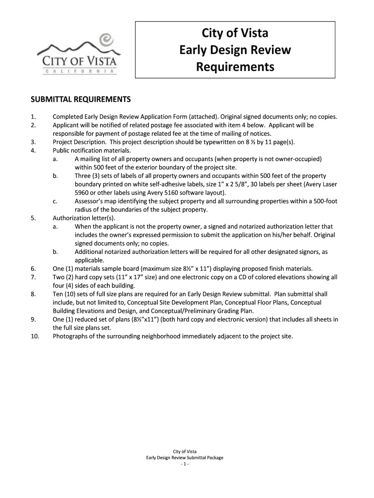 City of Vista Early Design Review Requirements SUBMITTAL REQUIREMENTS 1. 2. 3. 4.5.6. 7. 8.9. 10. Completed Early Design Review Application Form (attached). Original signed documents only; no copies.