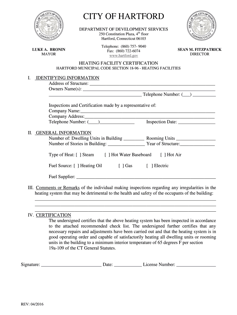 CITY OF HARTFORD DEPARTMENT OF DEVELOPMENT SERVICES 250 Constitution Plaza, 4th floor Hartford, Connecticut 06103 Telephone: (860) 757 9040 Fax: (860) 7226074 www.hartford.govLUKE A. CRONIN MAYORS