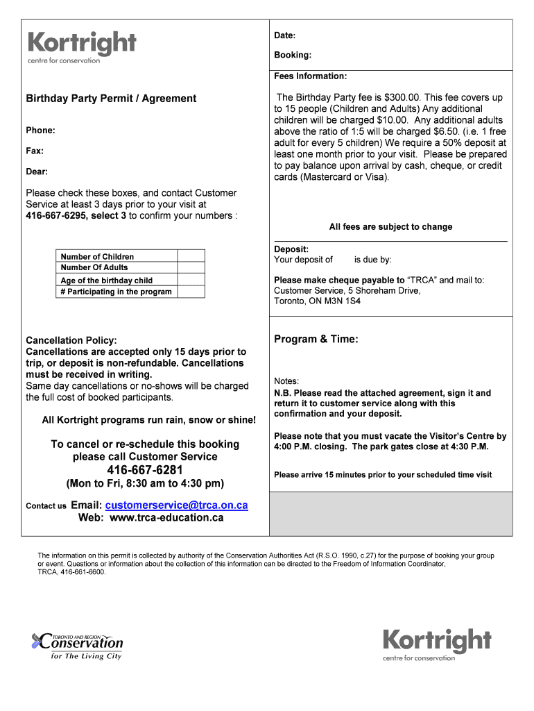 Individuals or groups planning to host a birthday party at a TRCA managed location must obtain the Birthday Party Permit Agreement. The Permit Holder carries the responsibility of adhering to the guidelines stipulated by the agreement.