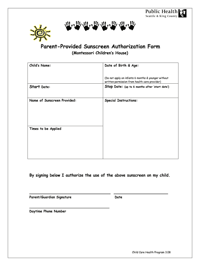 ParentProvided Sunscreen Authorization Form (Montessori Children's House) Child's Name:Date of Birth & Age:(Do not apply on infants 6 months & younger without written permission from health care provider)Start