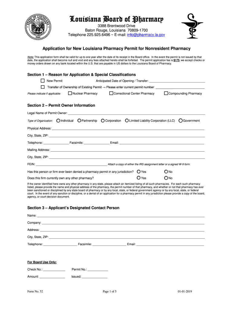 Louisiana Board of Pharmacy 3388 Brentwood Drive Baton Rouge, Louisiana 708091700 Telephone 225.925.6496 Email: info pharmacy.la.application for New Louisiana Pharmacy Permit for Nonresident Pharmacy