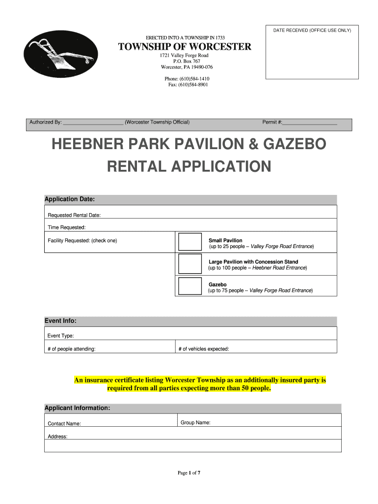 DATE RECEIVED (OFFICE USE ONLY)ERECTED INTO A TOWNSHIP IN 1733TOWNSHIP OF WORCESTER 1721 Valley Forge Road P.O. Box 767 Worcester, PA 19490076 Phone: (610)5841410 Fax: (610)5848901Authorized By: (Worcester