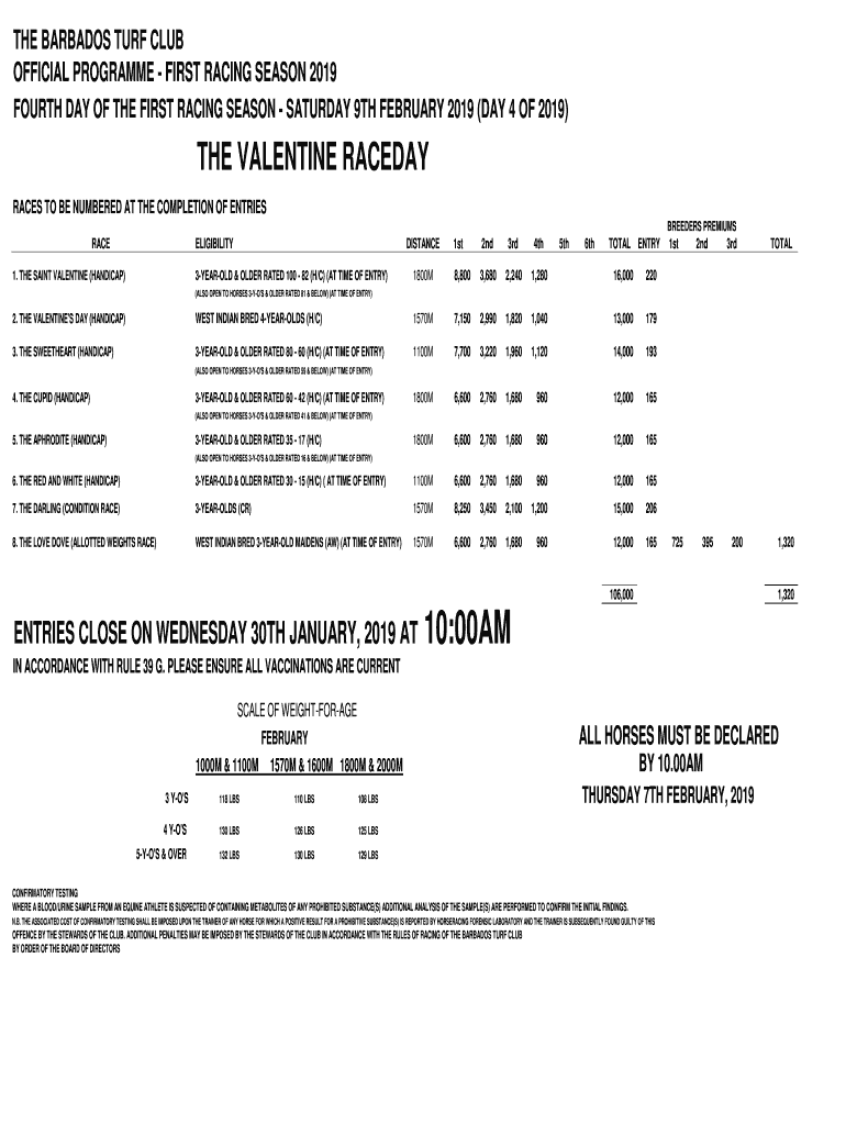 THE BARBADOS TURF CLUB OFFICIAL Program FIRST RACING SEASON 2019 FOURTH DAY OF THE FIRST RACING SEASON SATURDAY 9TH FEBRUARY 2019 (DAY 4 OF 2019)THE VALENTINE RACEWAY RACES TO BE NUMBERED AT THE COMPLETION
