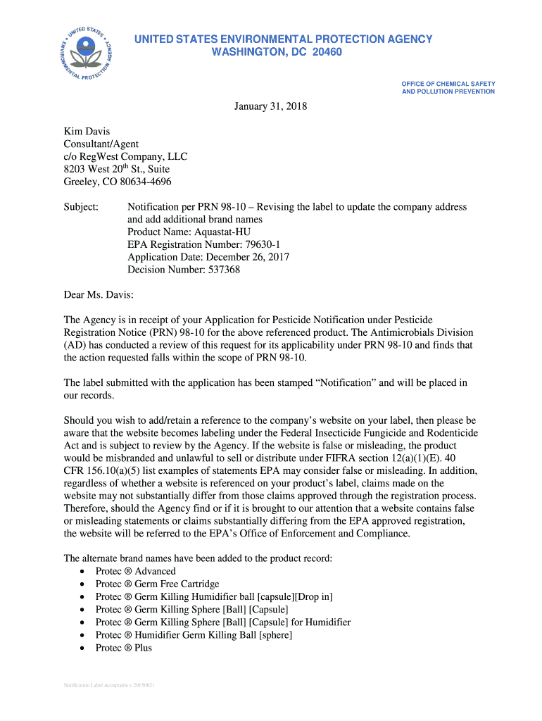 UNITED STATES ENVIRONMENTAL PROTECTION AGENCY WASHINGTON, DC 20460 OFFICE OF CHEMICAL SAFETY AND POLLUTION PREVENTION January 31, 2018, Kim Davis Consultant/Agent c/o Reg West Company, LLC 8203 West