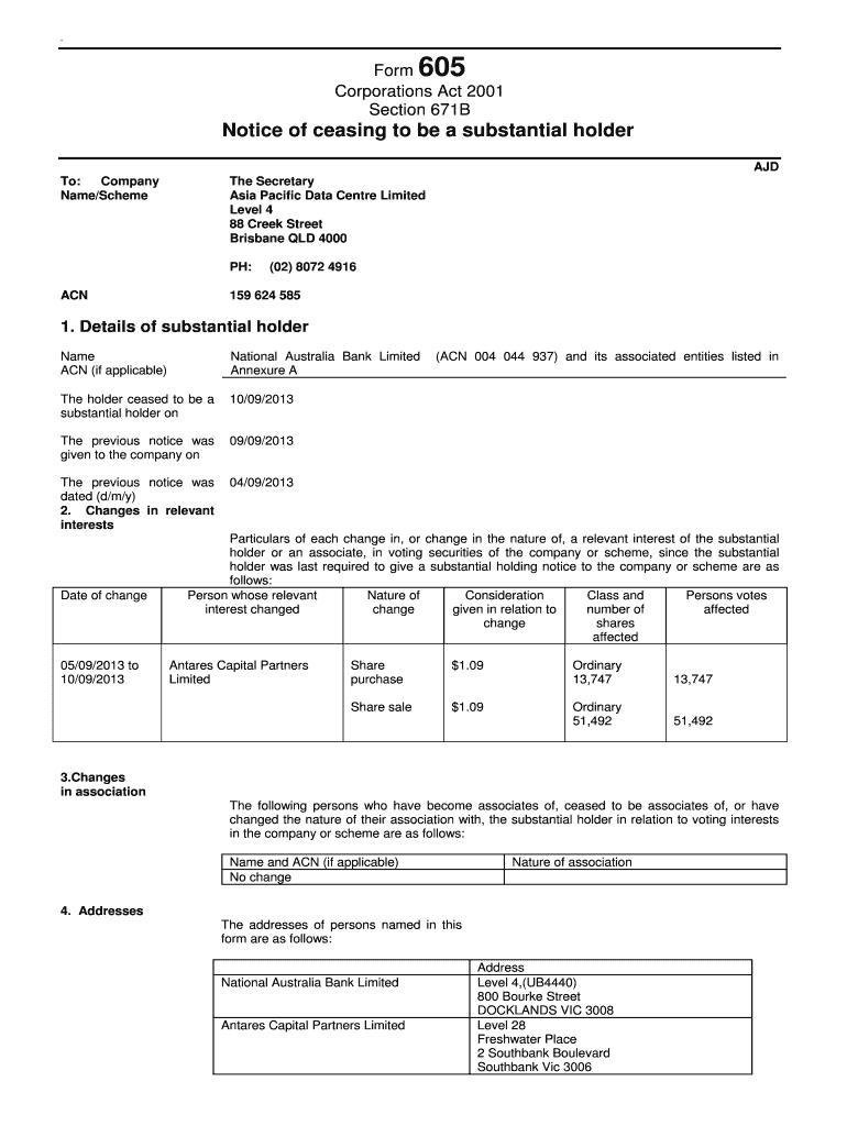605 Form Corporations Act 2001 Section 671B Notice of ceasing to be a substantial holder AND To: Company Name/Scheme The Secretary Asia Pacific Data Center Limited Level 4 88 Creek Street Brisbane