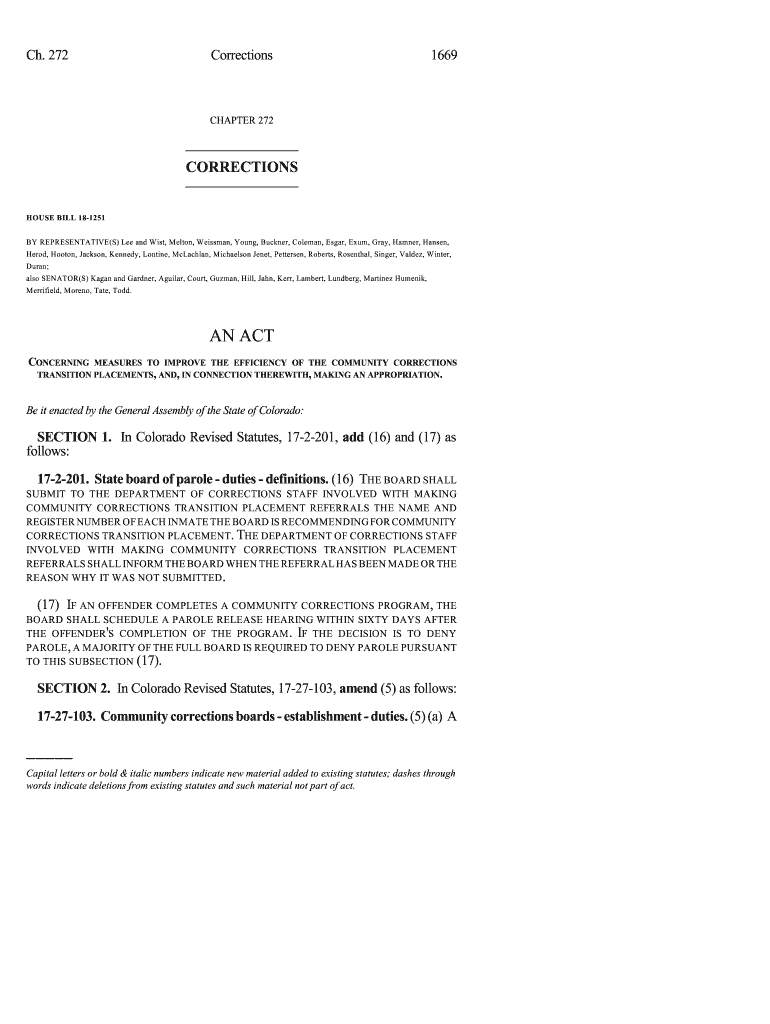 Ch. 272Corrections1669CHAPTER 272 CORRECTIONS HOUSE BILL 181251 BY REPRESENTATIVE(S) Lee and Wist, Melton, Waksman, Young, Buckner, Coleman, Edgar, Exam, Gray, Hammer, Hansen, Herod, Horton, Jackson,