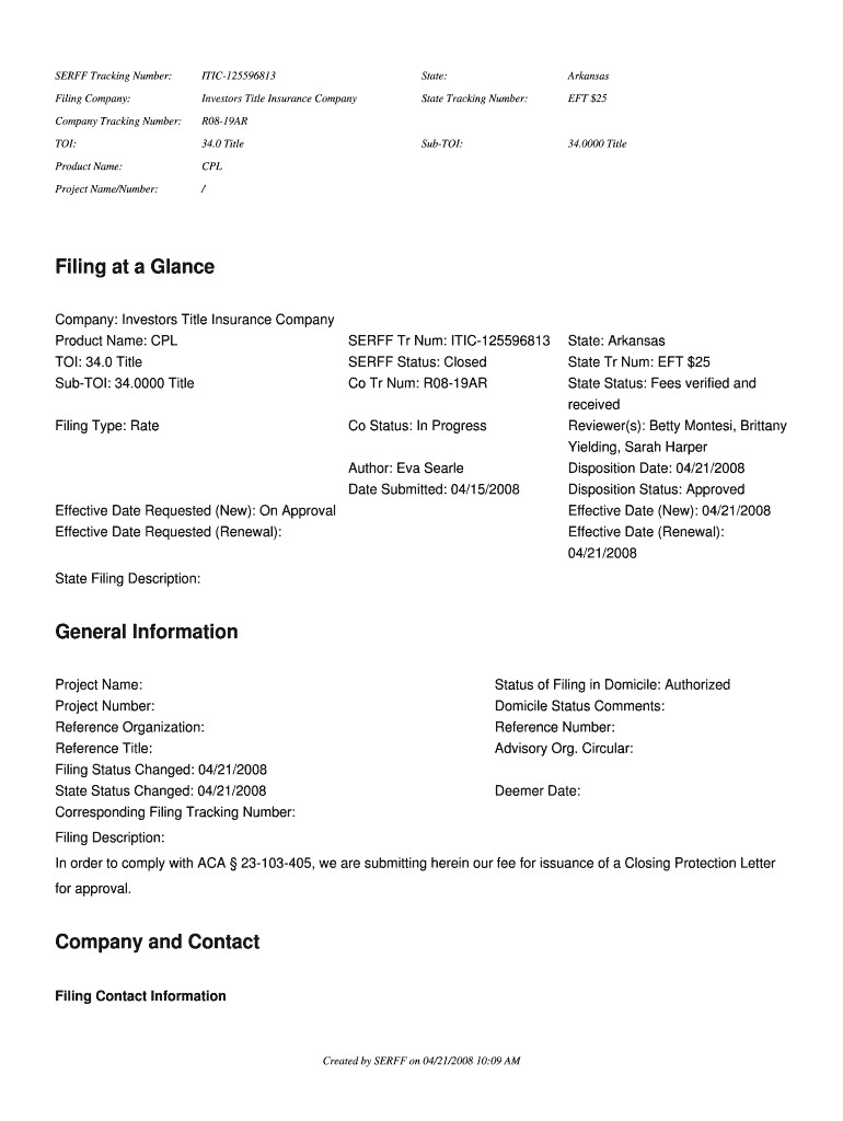 SERFS Tracking Number: ITIC125596813 State: Arkansas Filing Company: Investors Title Insurance Company State Tracking Number: EFT $25 Company Tracking Number: R0819AR TO: 34.0 Title Subtle: 34.0000