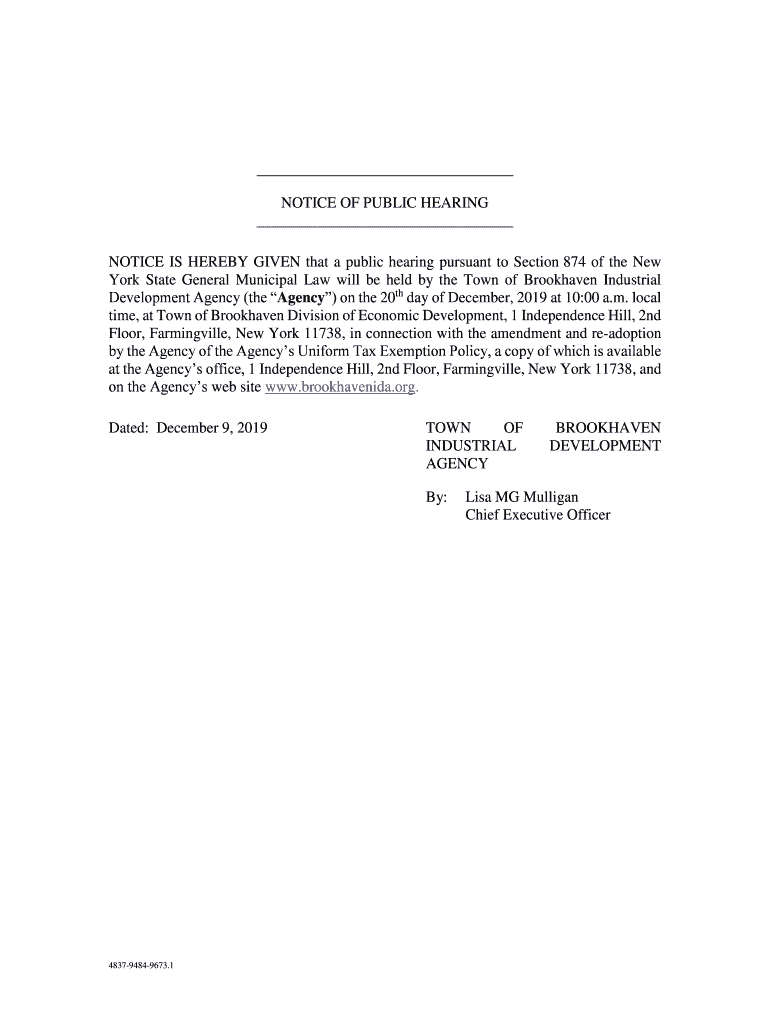NOTICE OF PUBLIC HEARING NOTICE IS HEREBY GIVEN that a public hearing pursuant to Section 874 of the New York State General Municipal Law will be held by the Town of Brookhaven Industrial Development